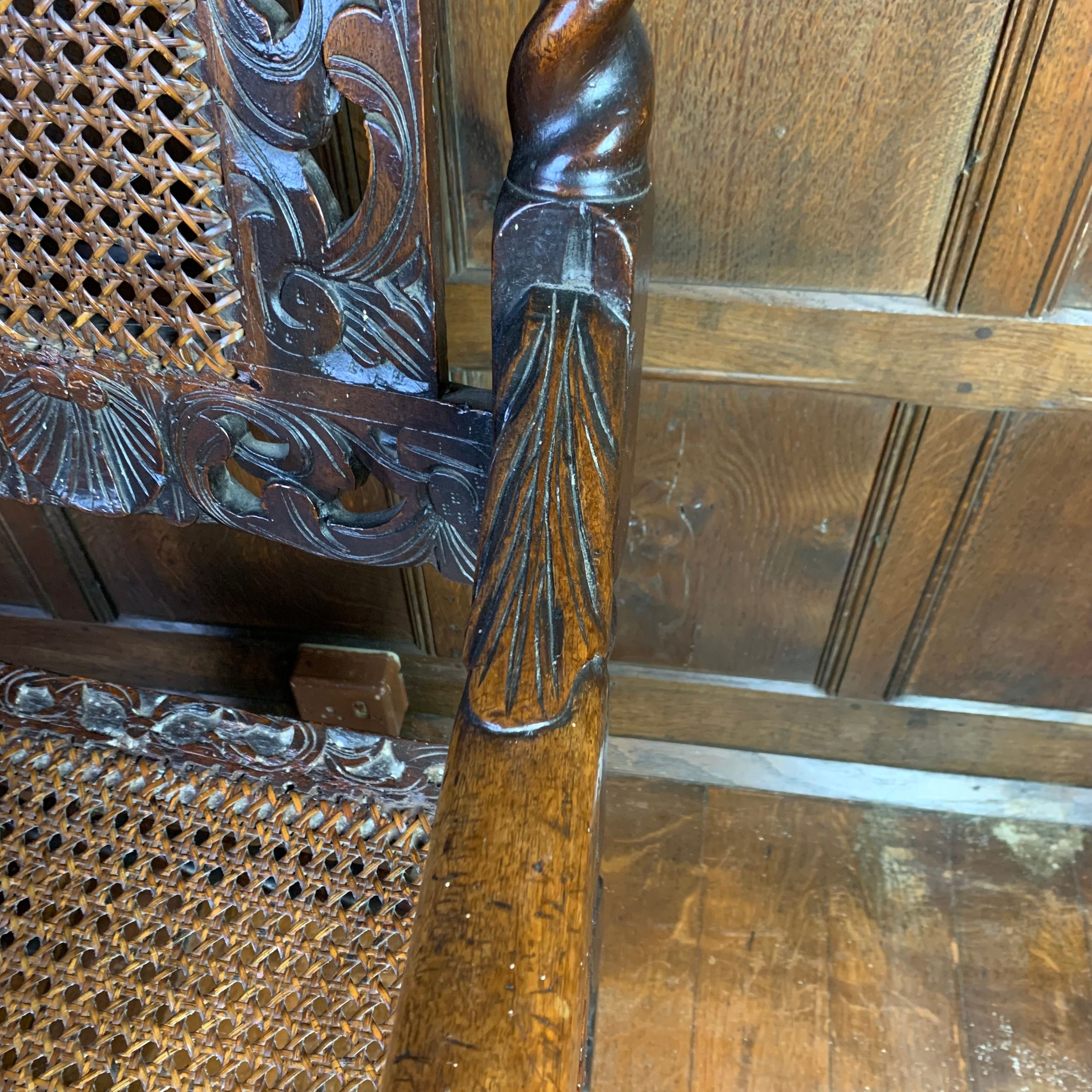 A well carved, high back, genuine 17th century Carolean walnut armchair, carved with flowerheads and foliate scrolls and a shell at the centre of the top rail, with caned back panels and seats. The chair dates to about 1680 and is in sound condition for the age.