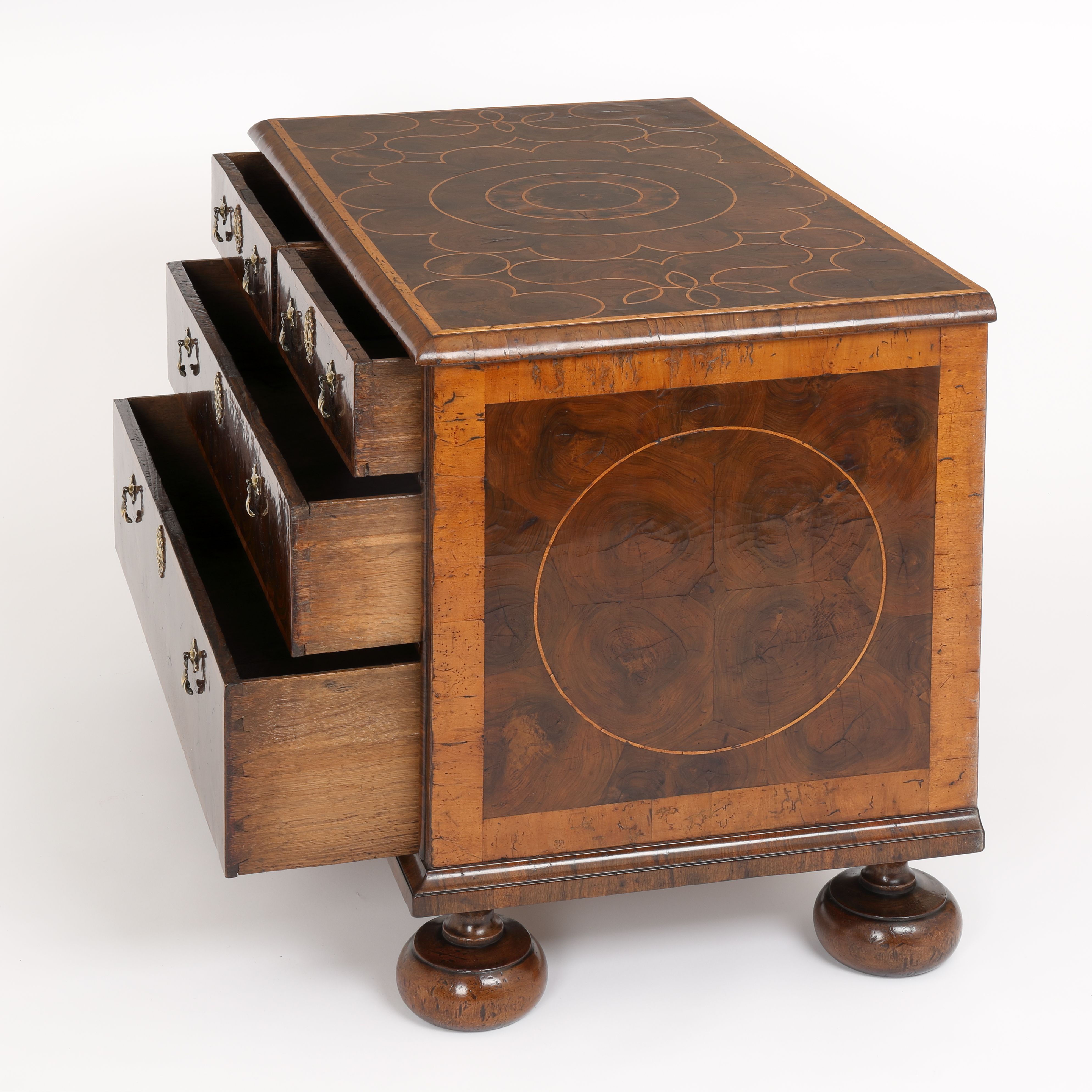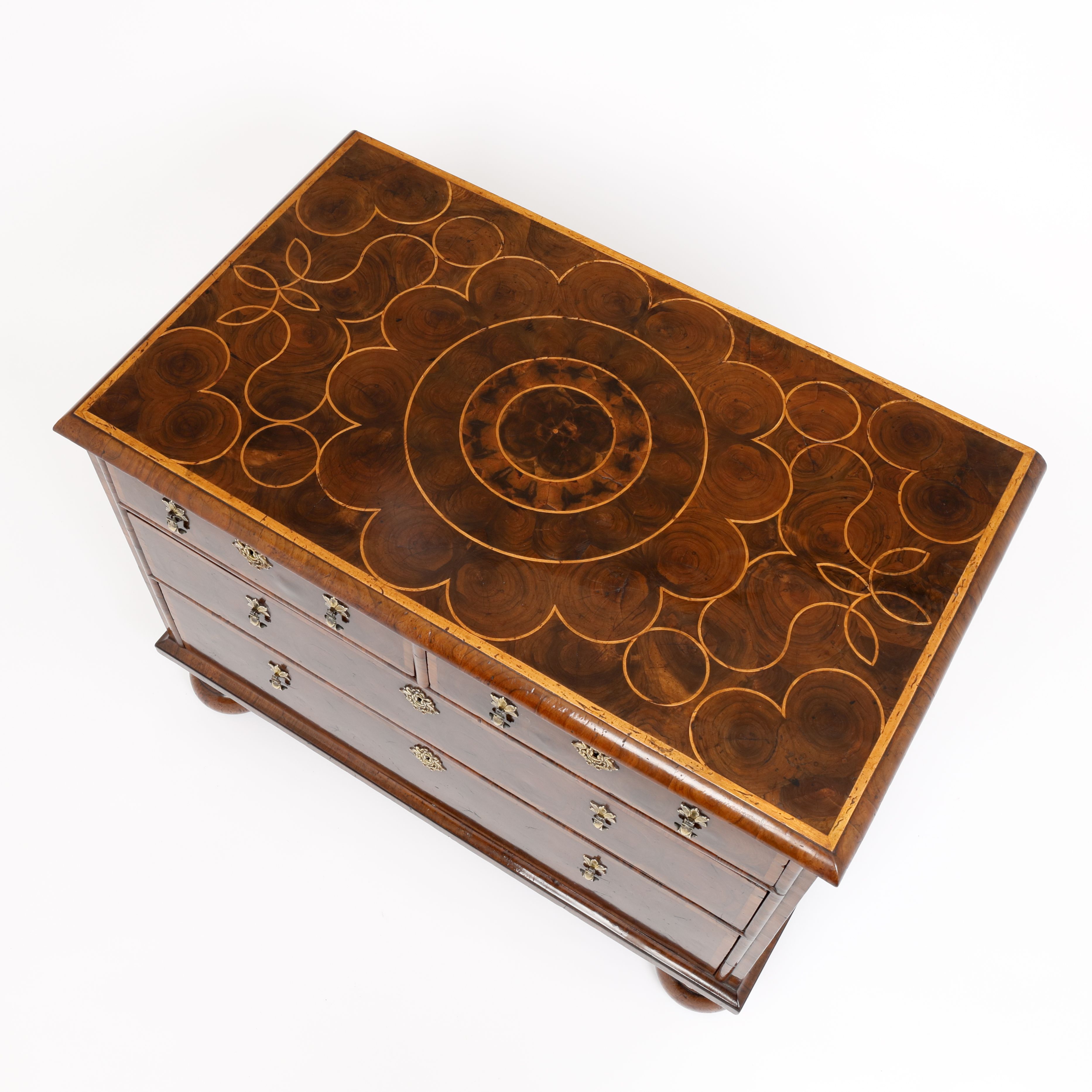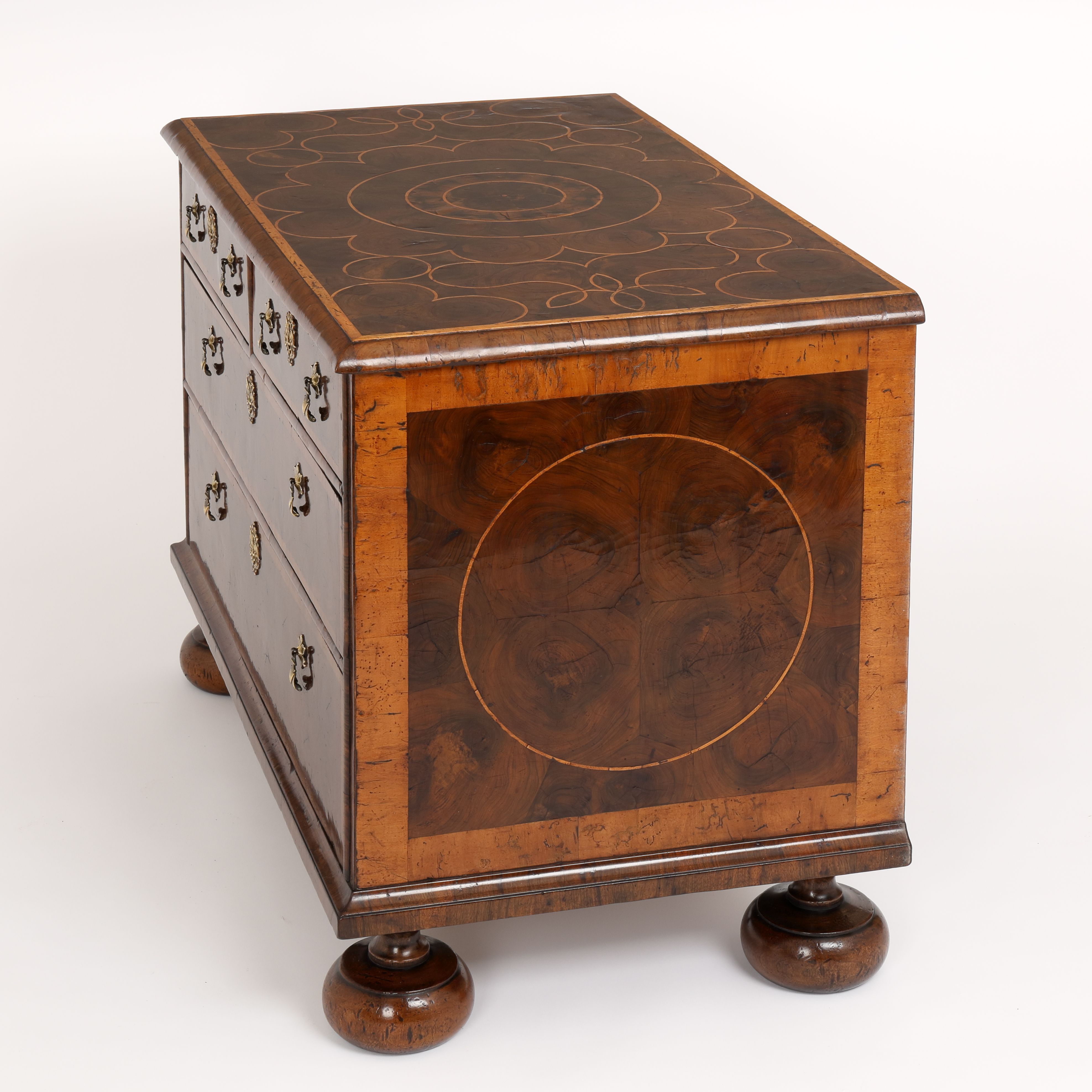 An exceptional and very rare mid 17th century Charles II olive wood chest of drawers of low proportions Veneered with 'oyster-cut" veneers of olive wood and crossbanded in Holly with a geometric pattern to the top and large inlaid circles to each side.