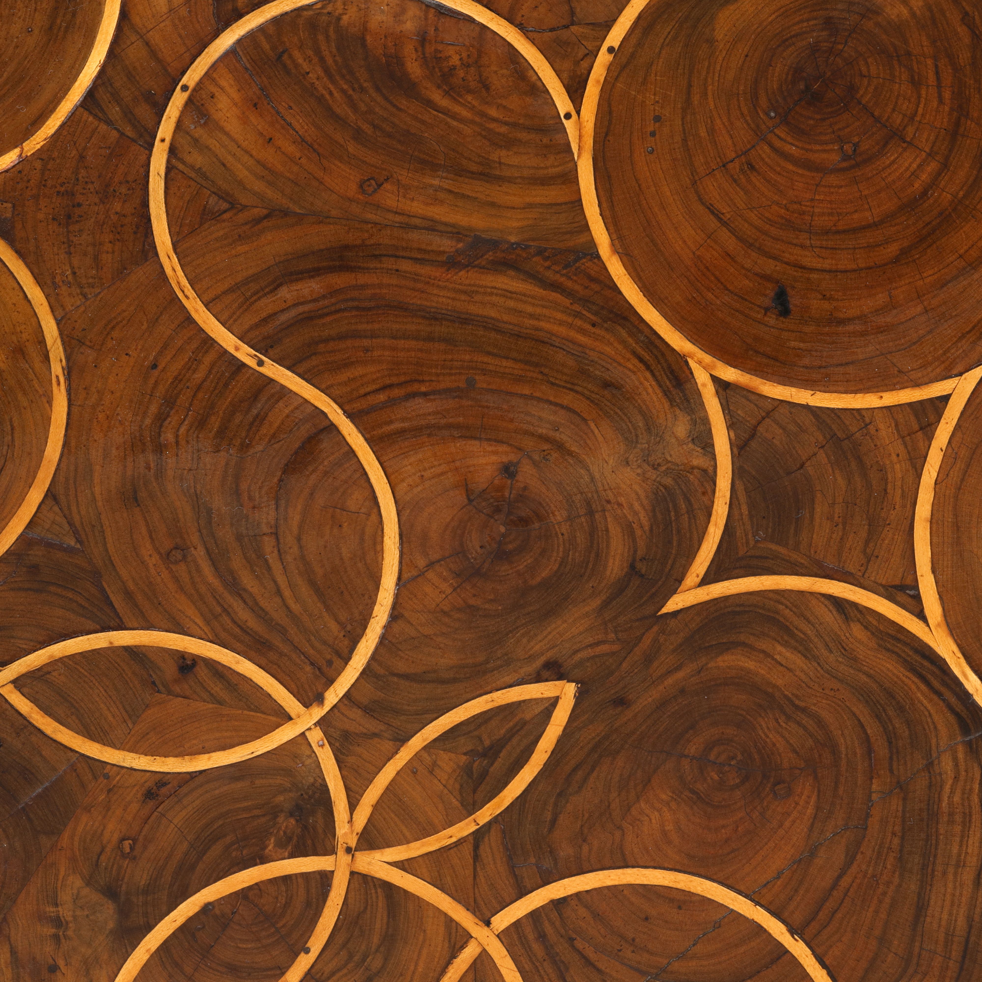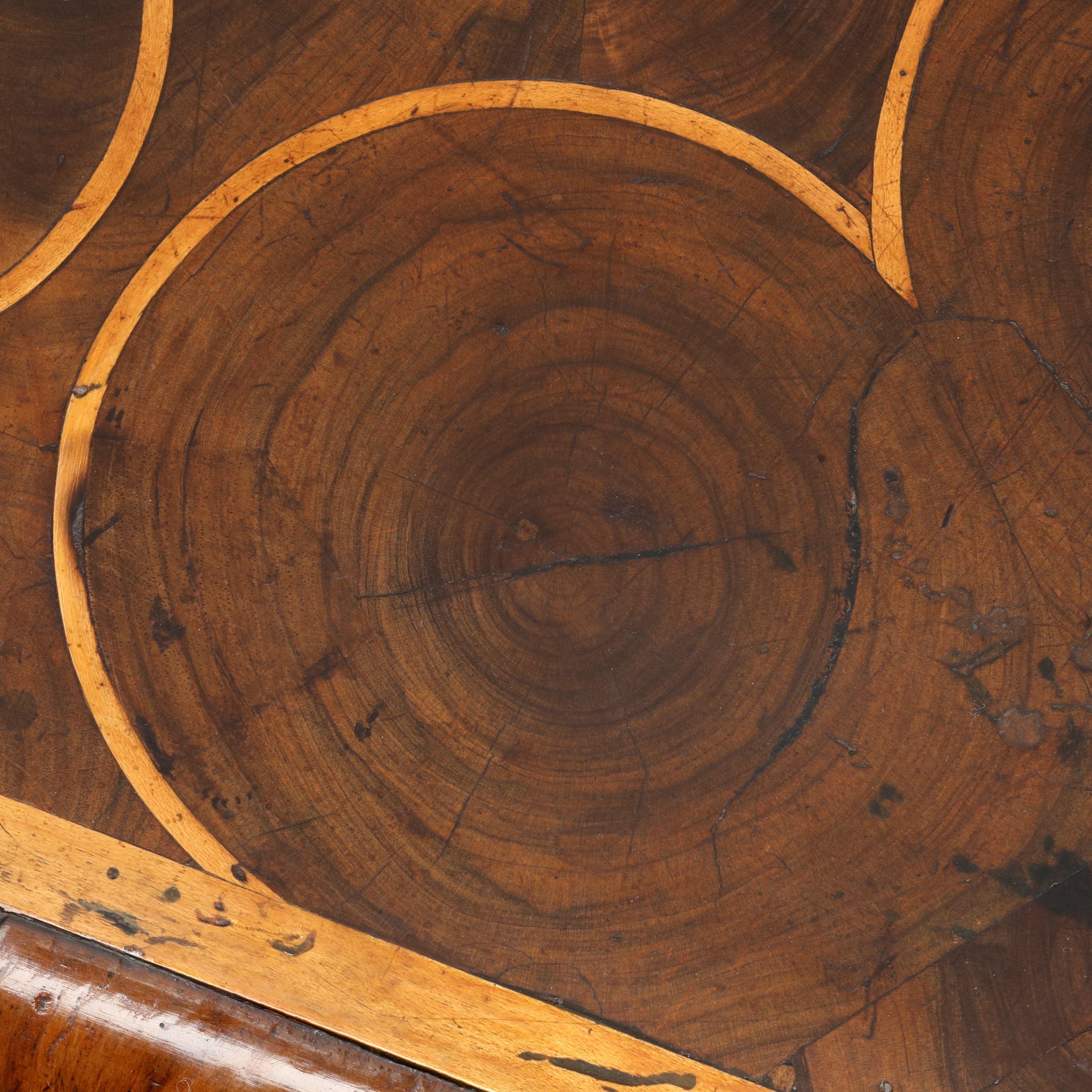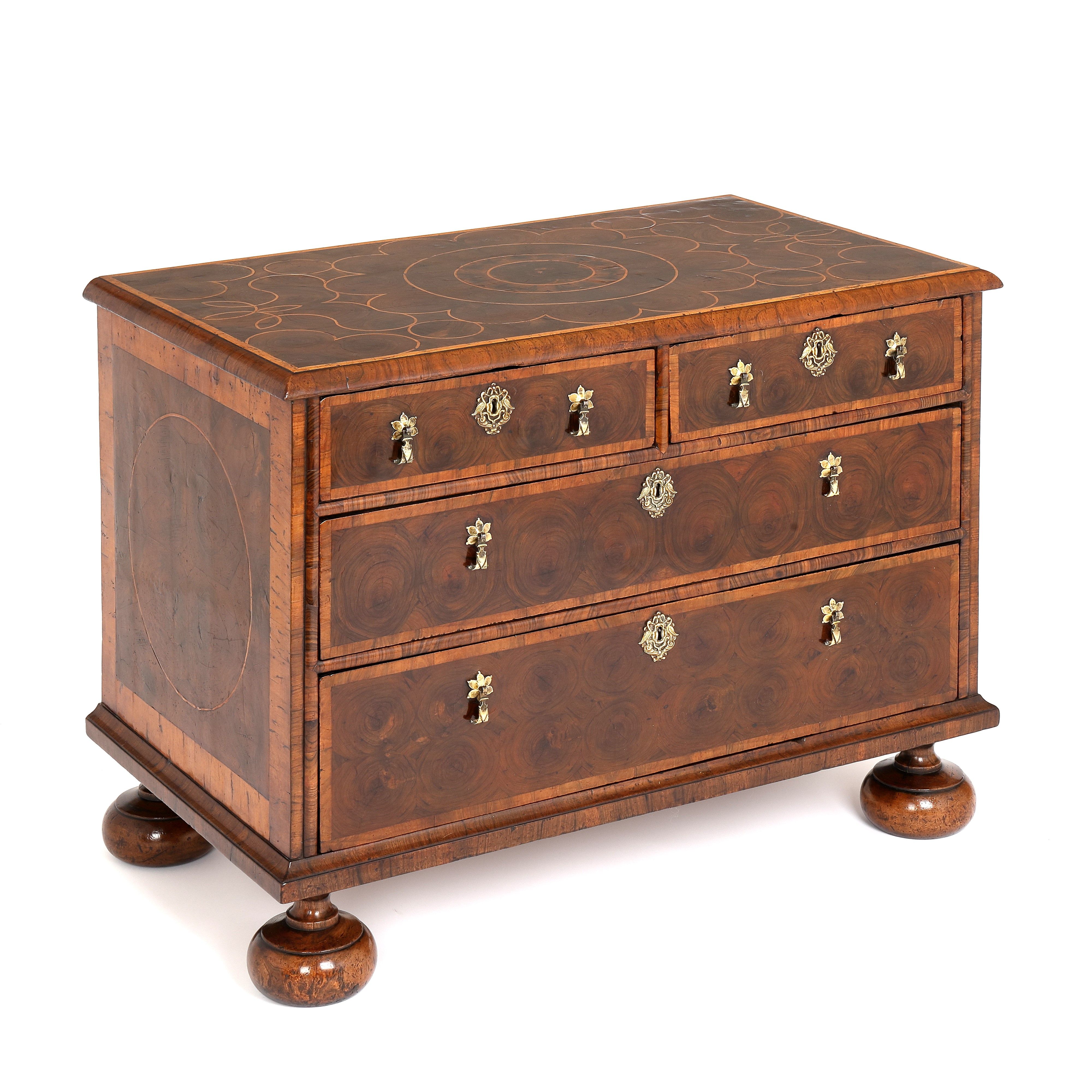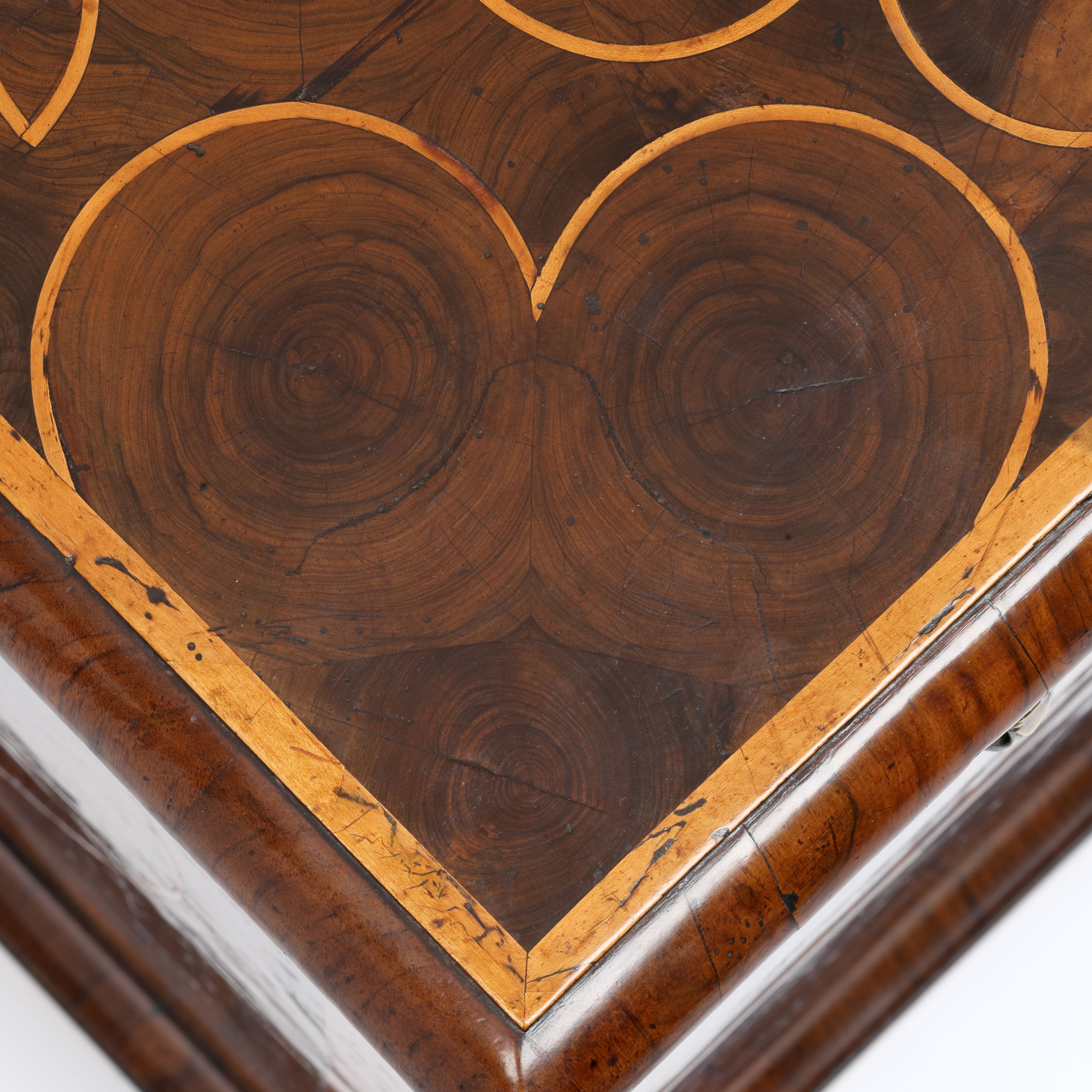 An exceptional and very rare mid 17th century Charles II olive wood chest of drawers of low proportions Veneered with 'oyster-cut" veneers of olive wood and crossbanded in Holly with a geometric pattern to the top and large inlaid circles to each side.
