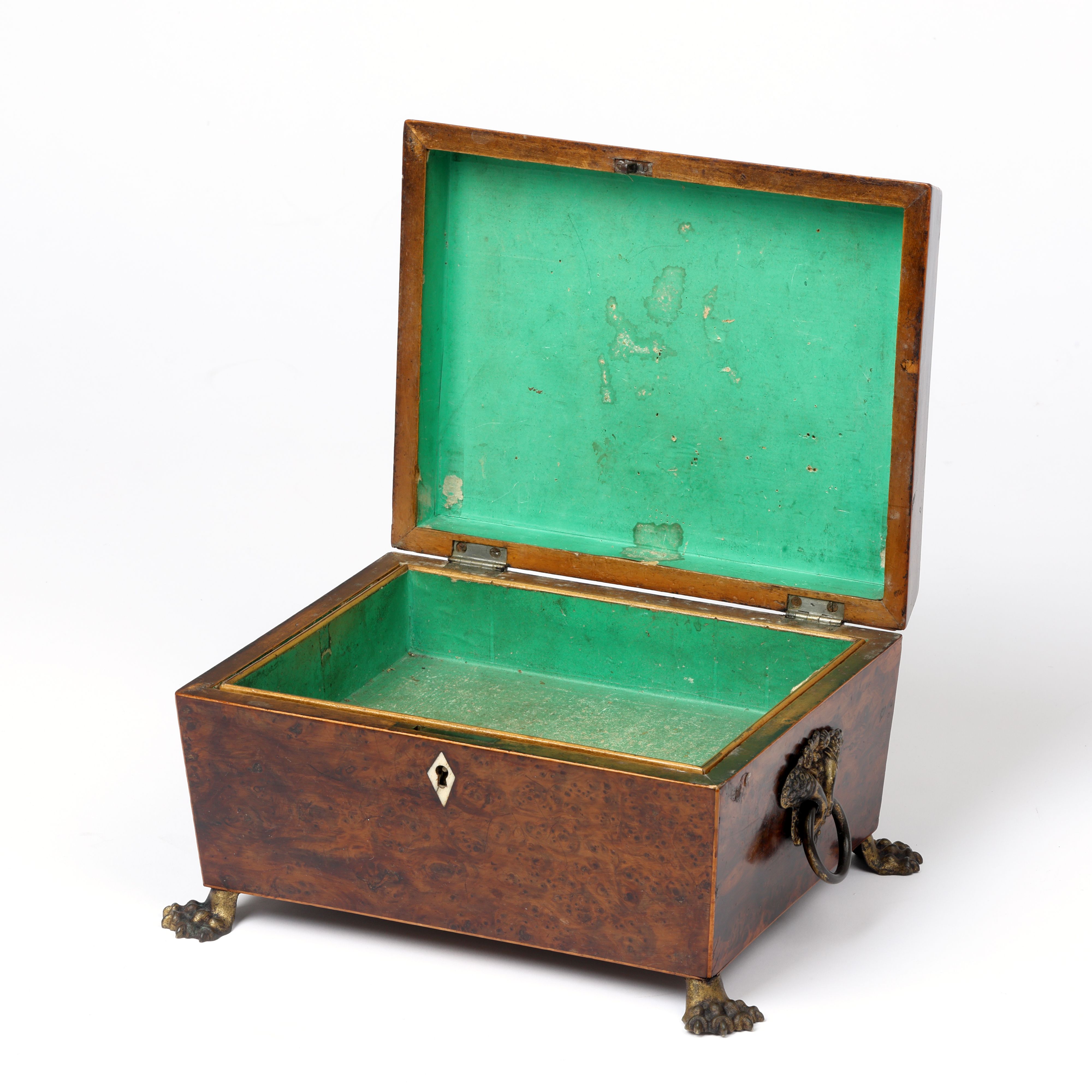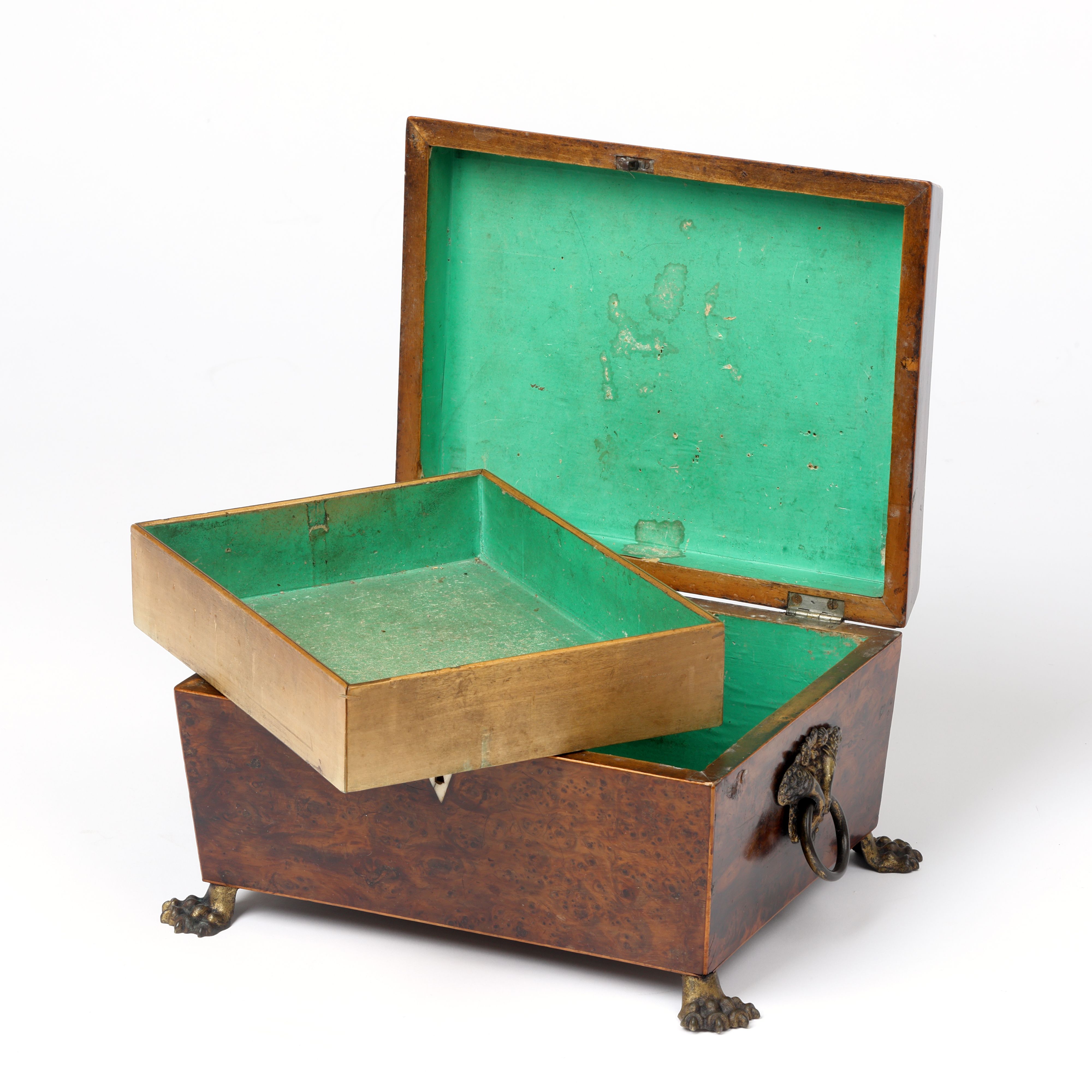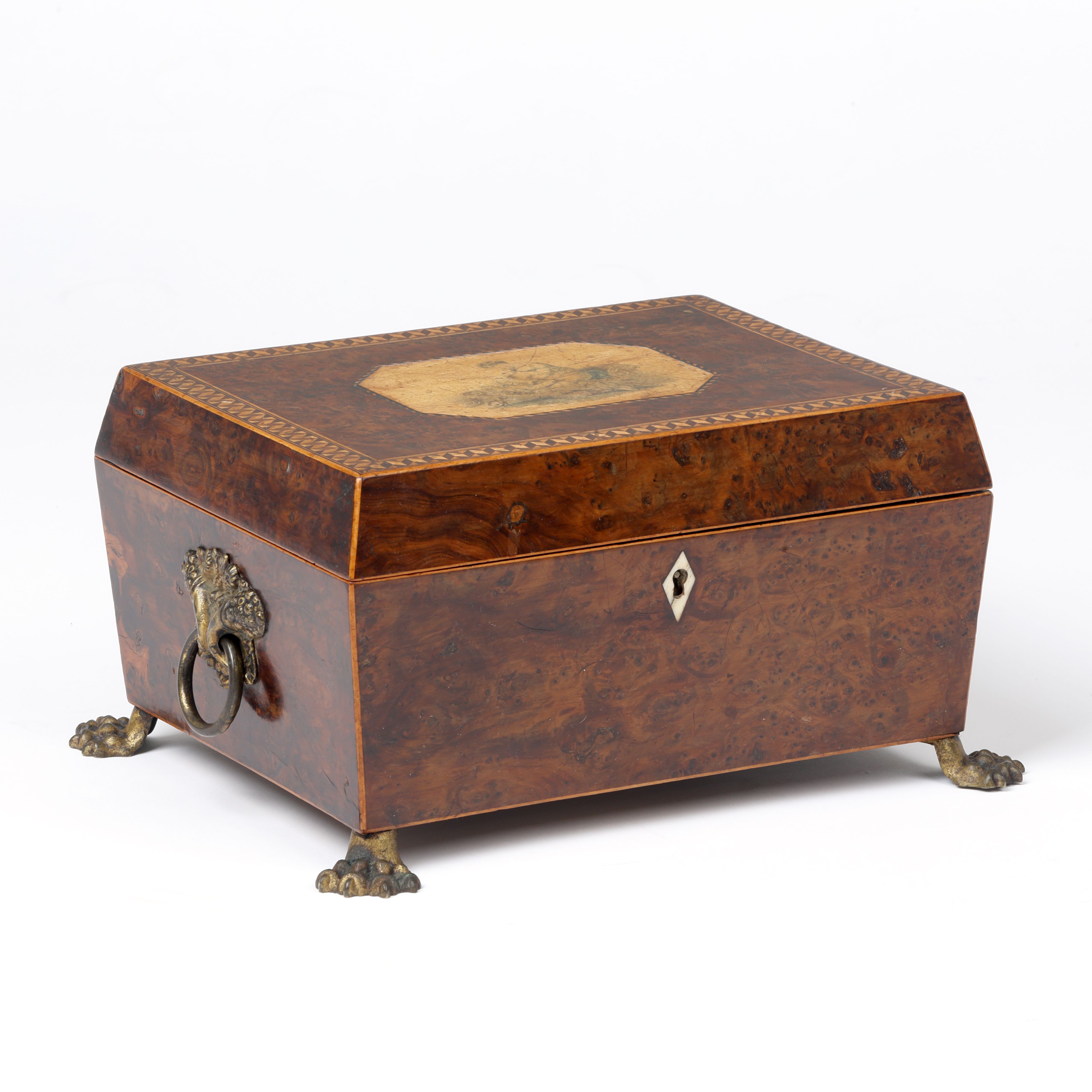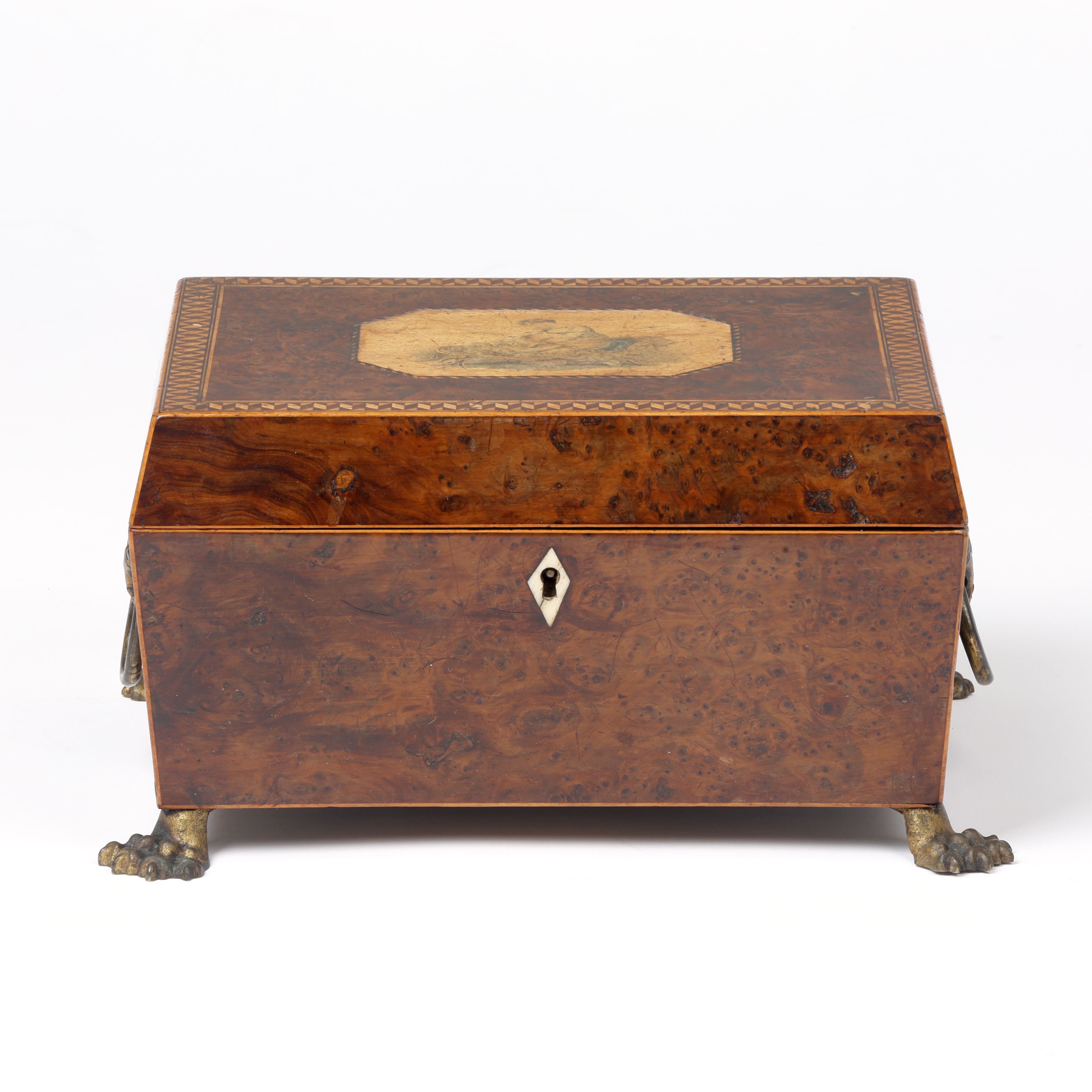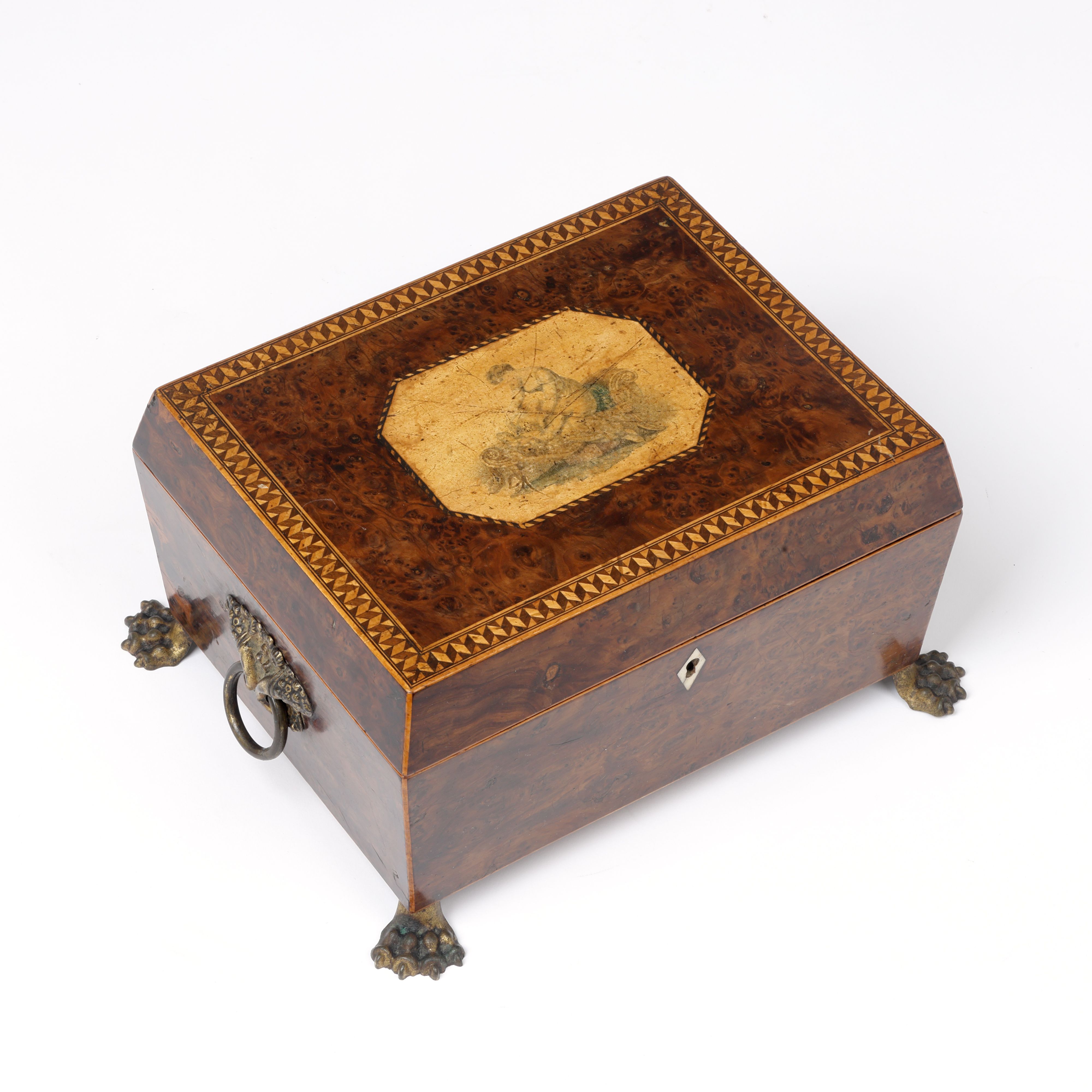 An early 19th century burr yew wood needlework or jewellery box, the top decorated with a classical scene surrounded by chequered banding. Raised on brass animal paw feet.