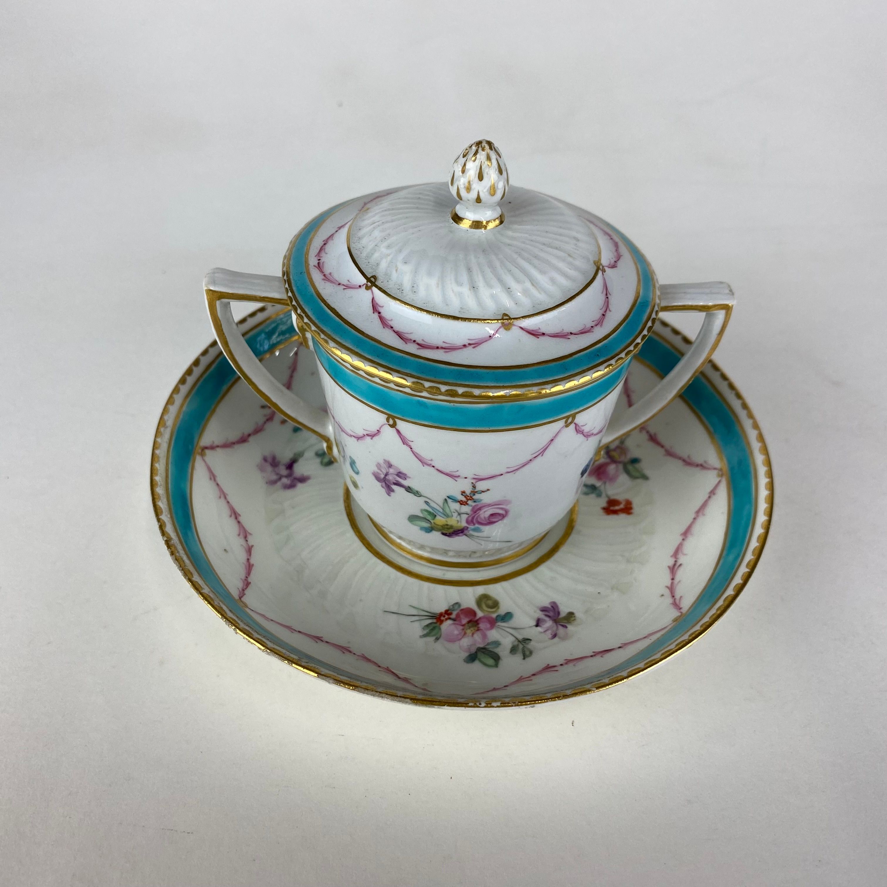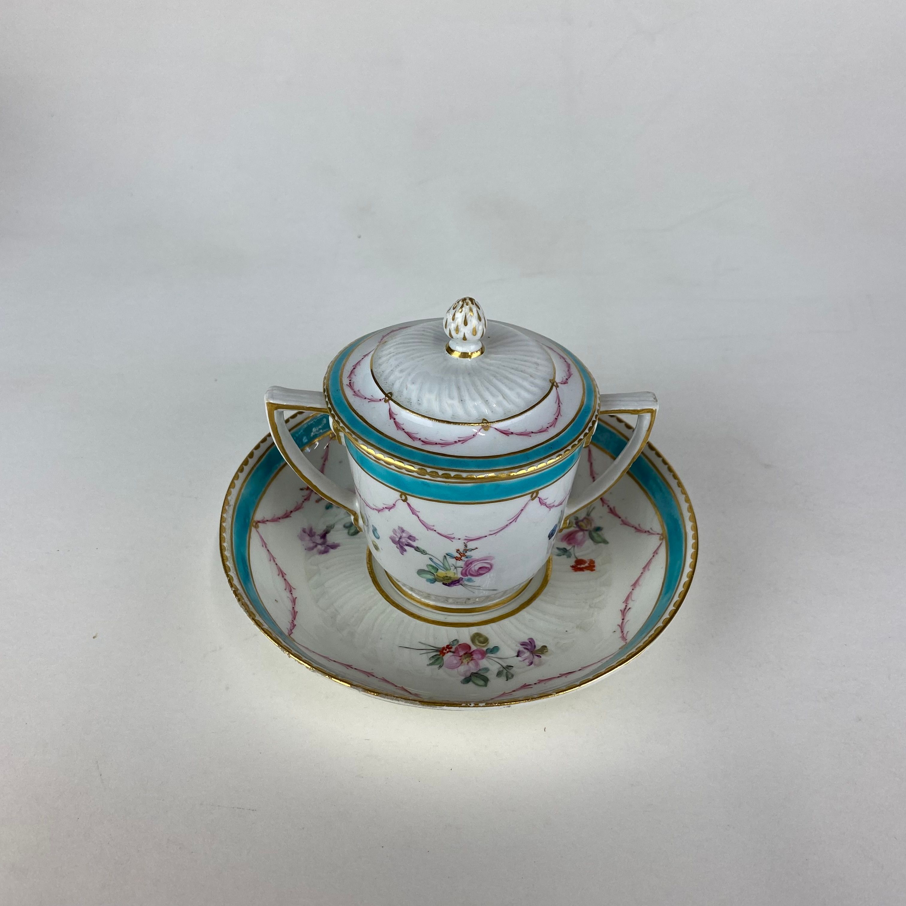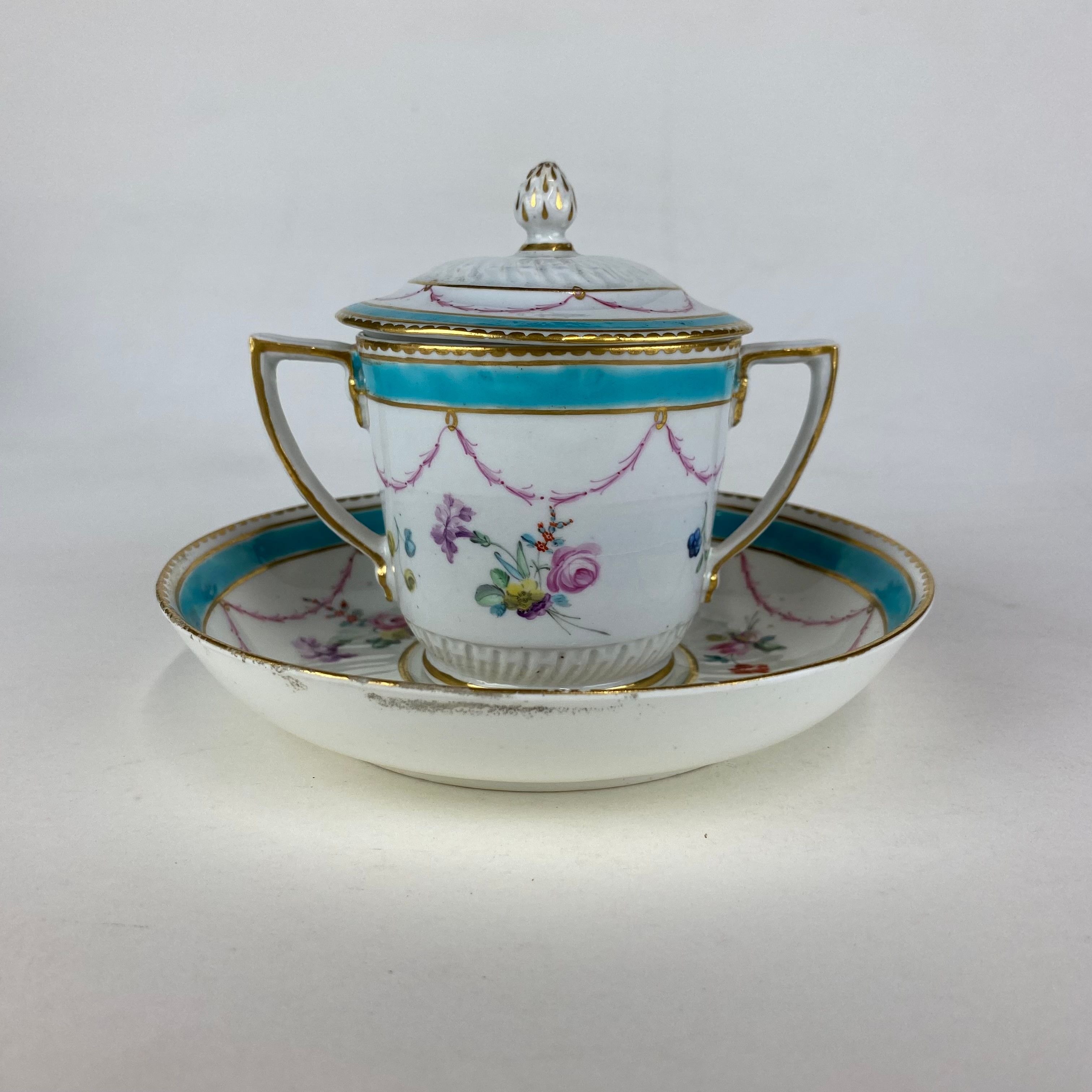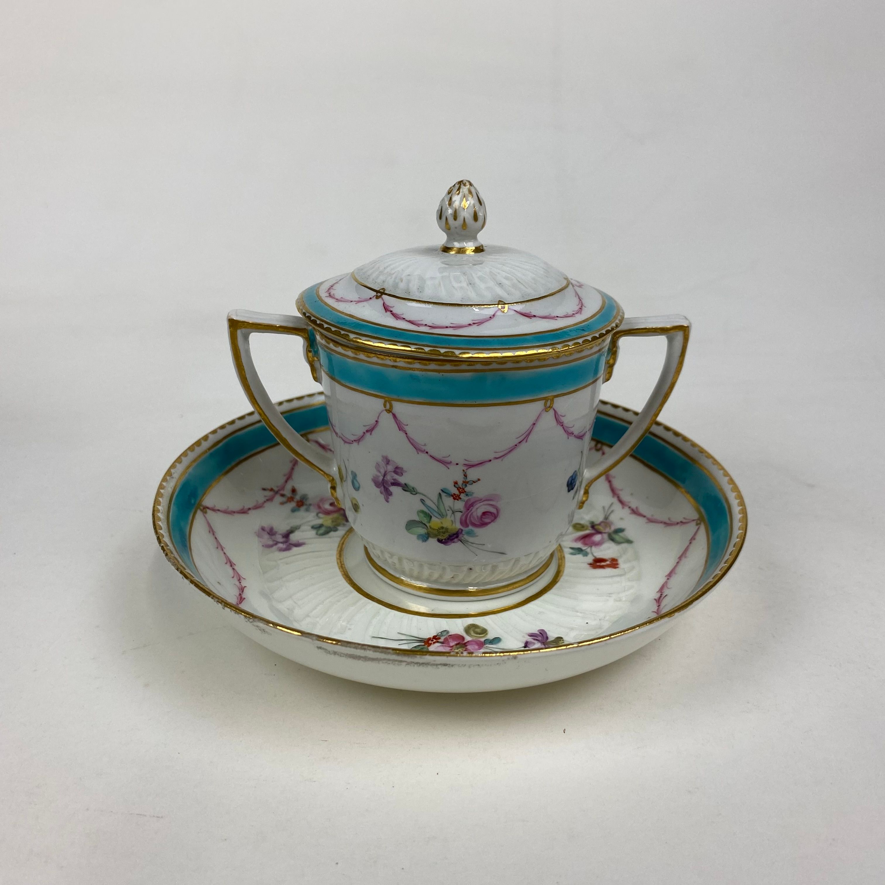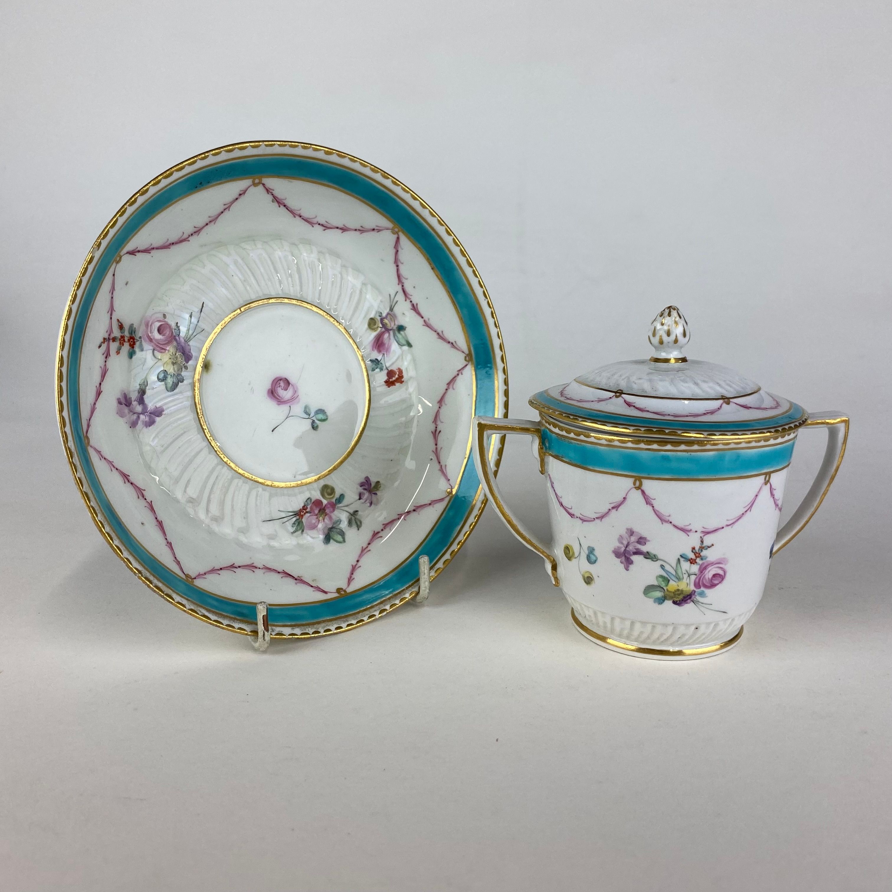 Delightful Duesbury Derby two handled chocolate cup, cover and stand, decorated in polychrome enamels with garlands of flowers.