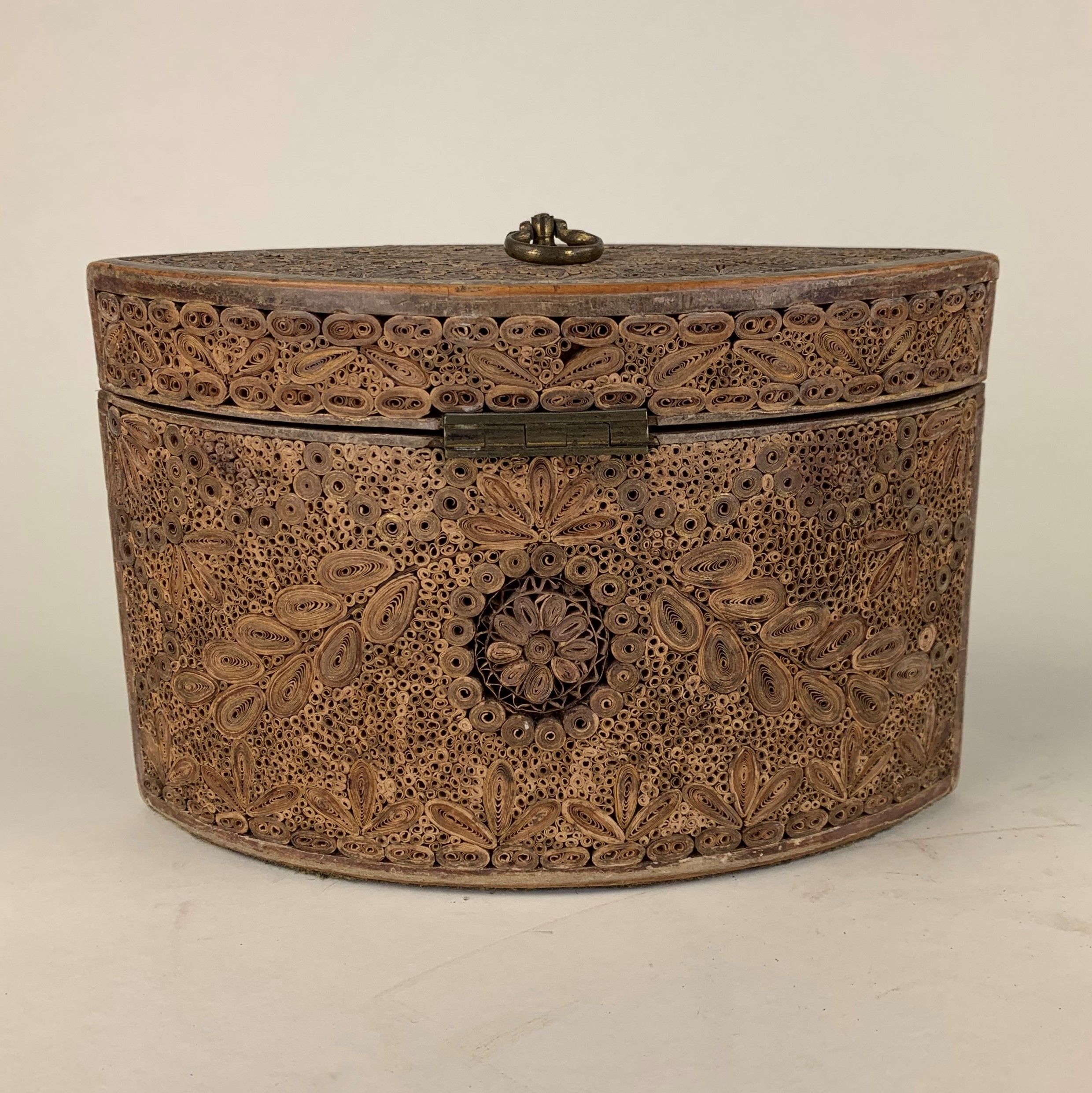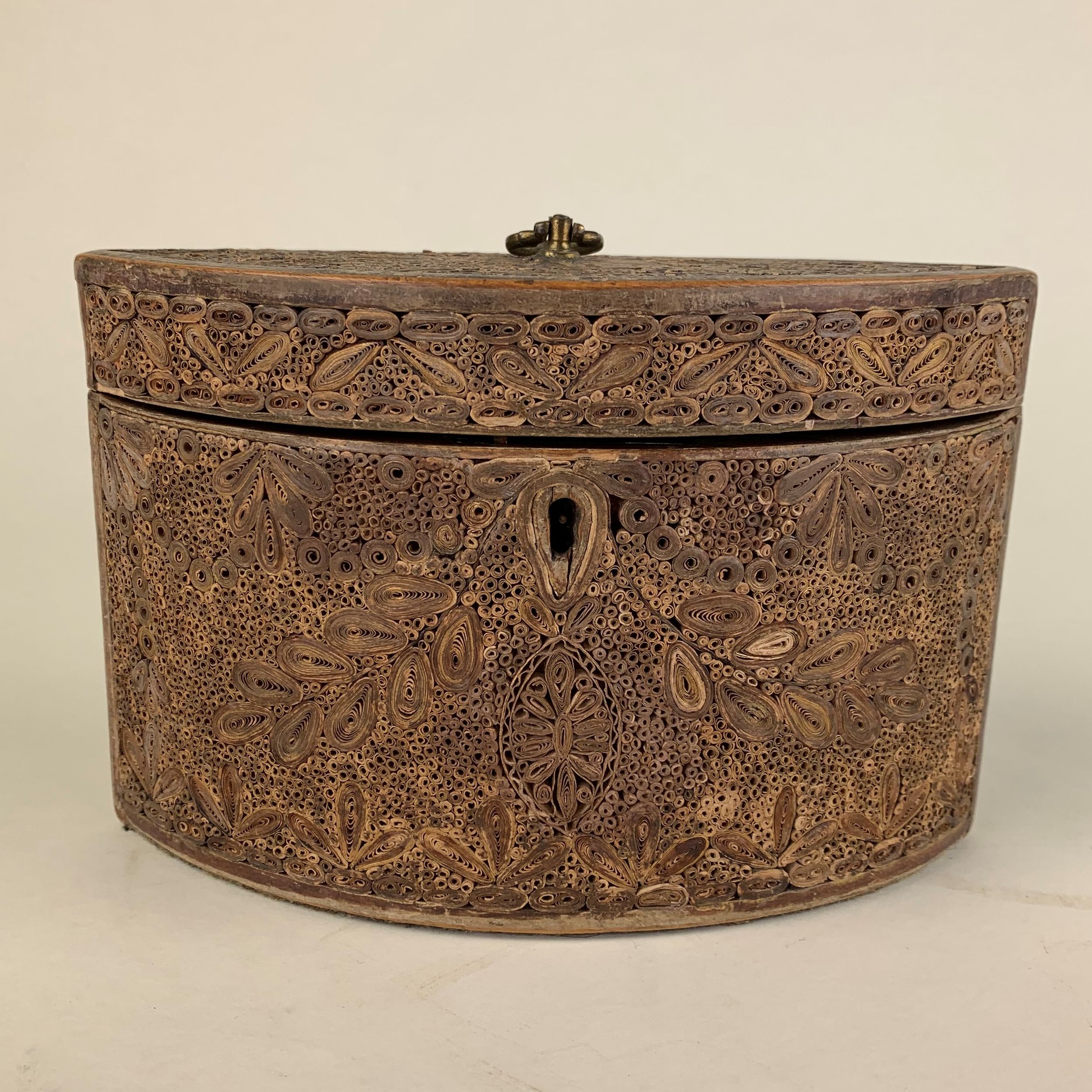 A fine quality rolled/scrolled paperwork single compartmemt tea caddy in good originl condition with minor losses. Decorated all-over with applied scrolls of gilt edged and coloured paper, with original green baize to base and original lock. the interior with traces of original tin-paper lining.