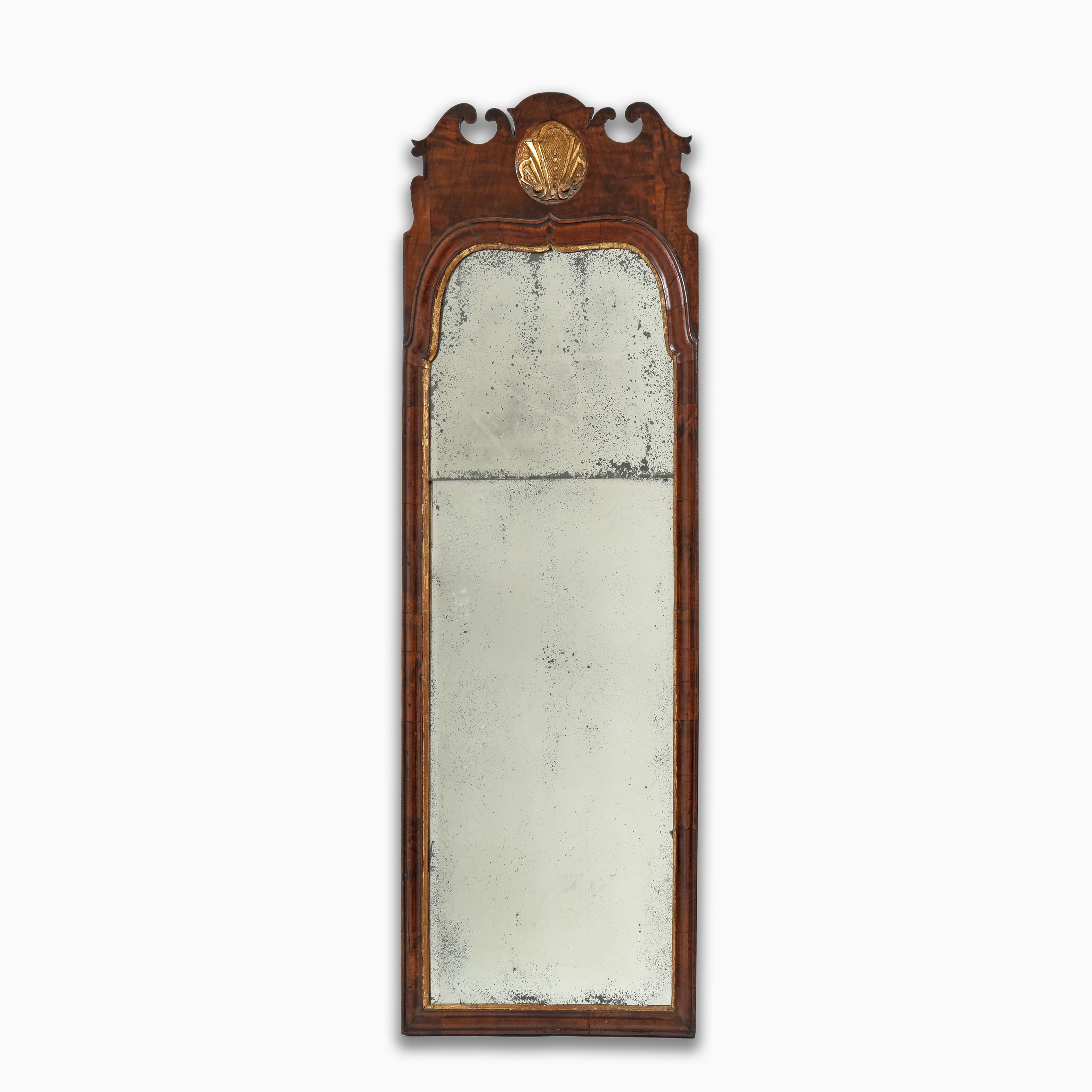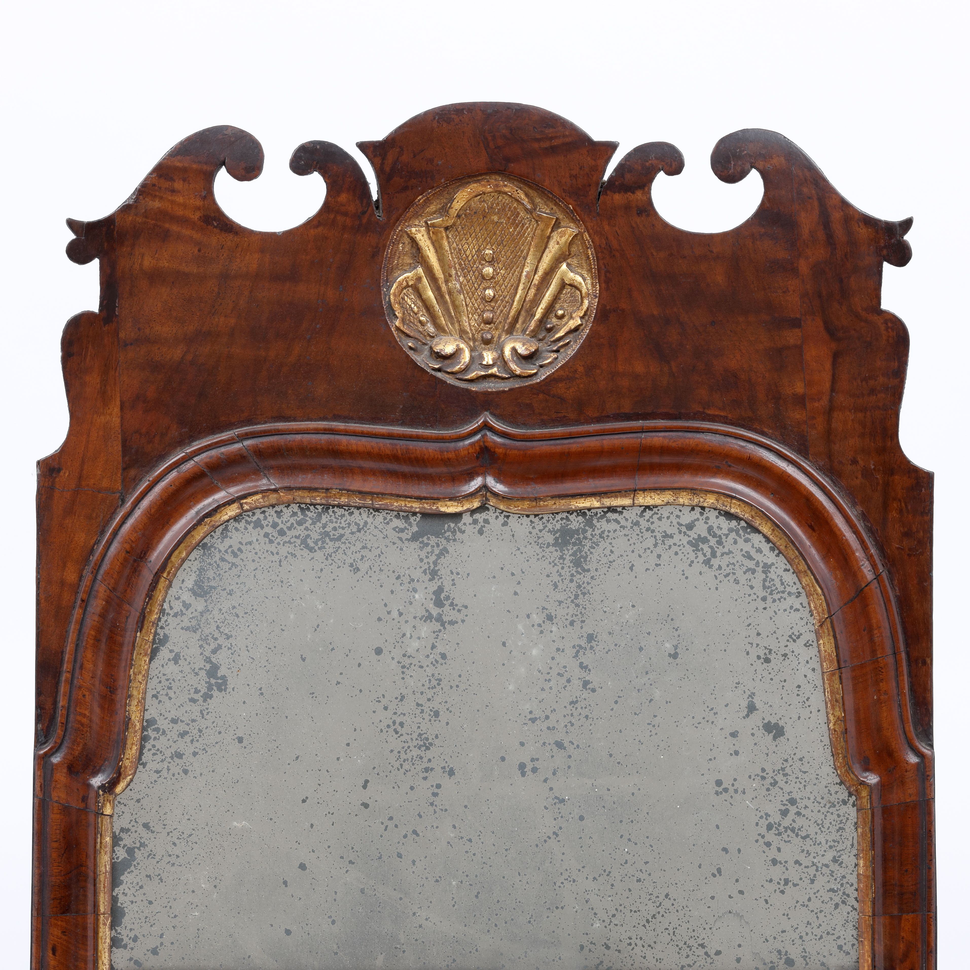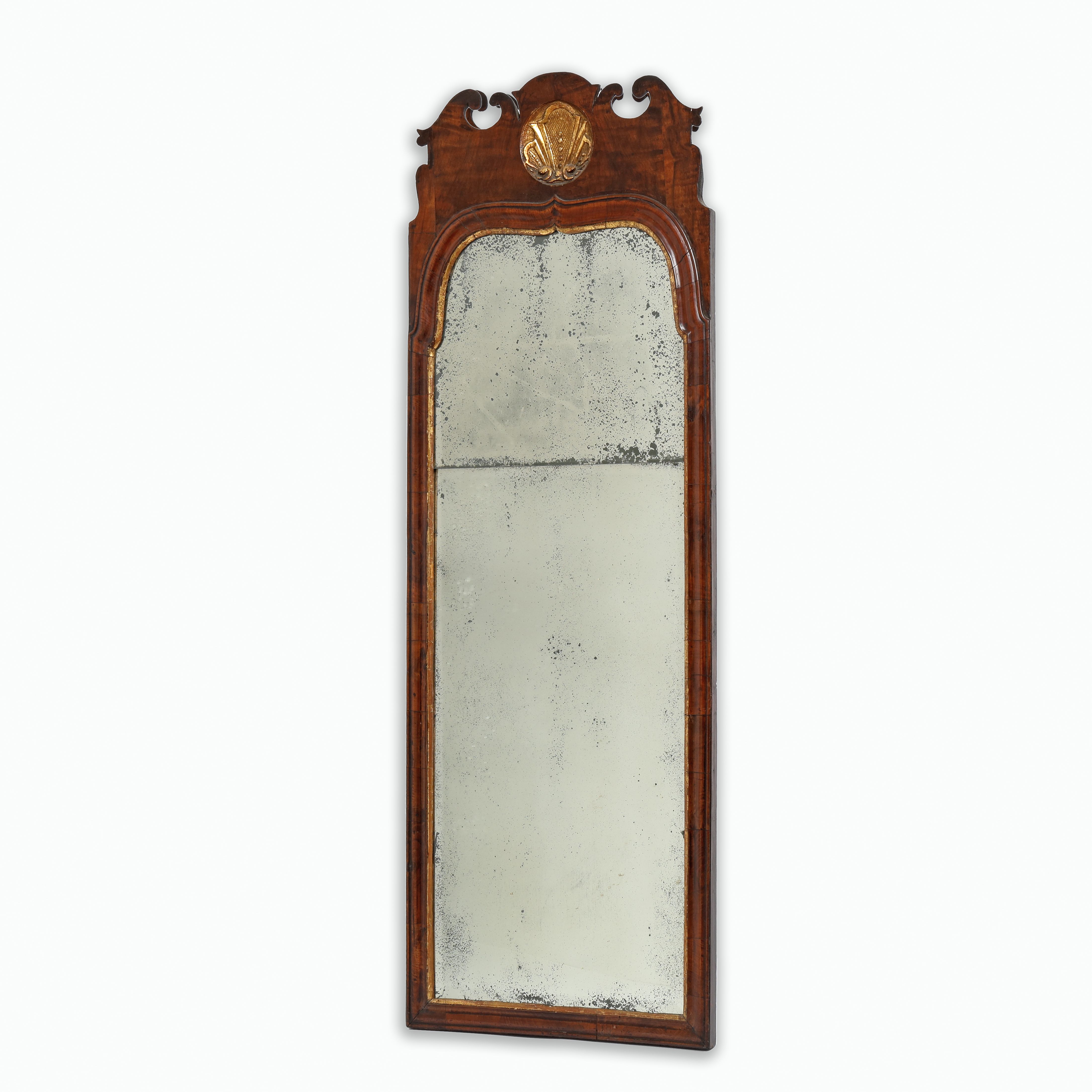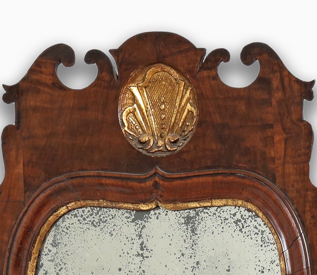 This fine mirror is made of two pieces of glass , as is typical, the top one being shaped according to the frame. The frame has a gilded sight edge enclosed in a convex moulding, cross-grain-veneed in beautifully patinated walnut.