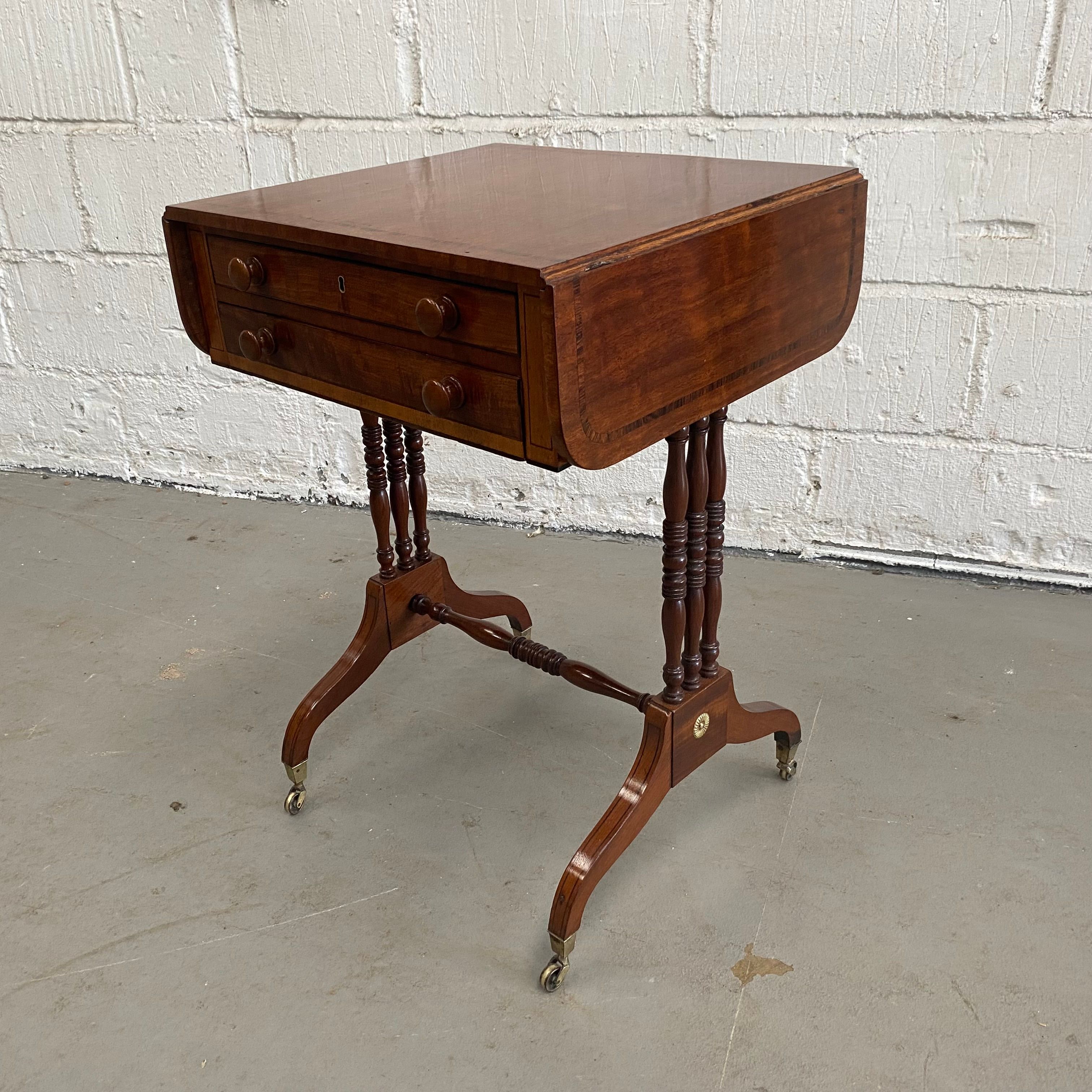 An attractive Regency period mahogany drop-flap lamp table. The Coramandel wood cross-banded top above two drawers, supported on triple turned column end supports raised on swept tapering legs with brass cups and castors and joined by a turned stretcher.