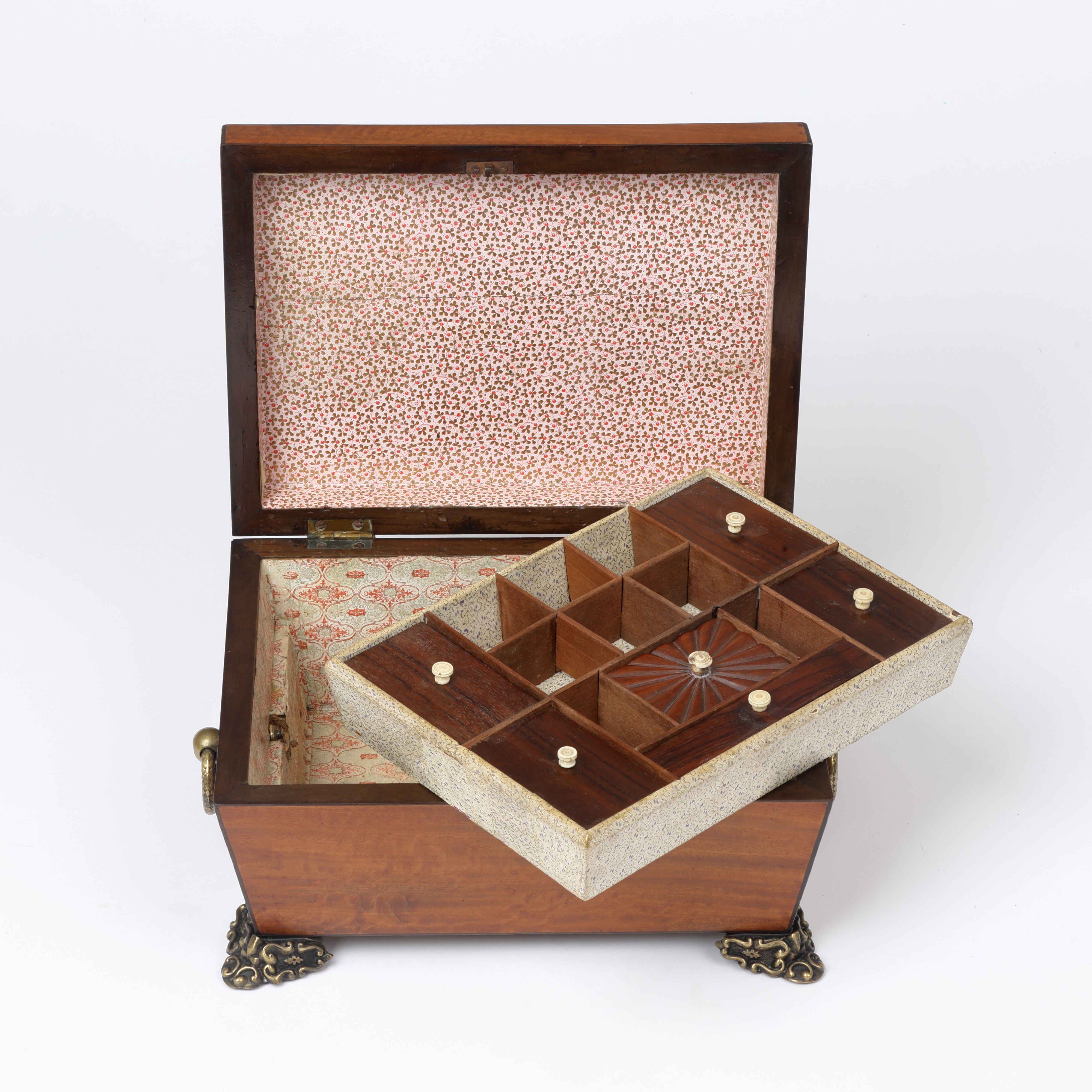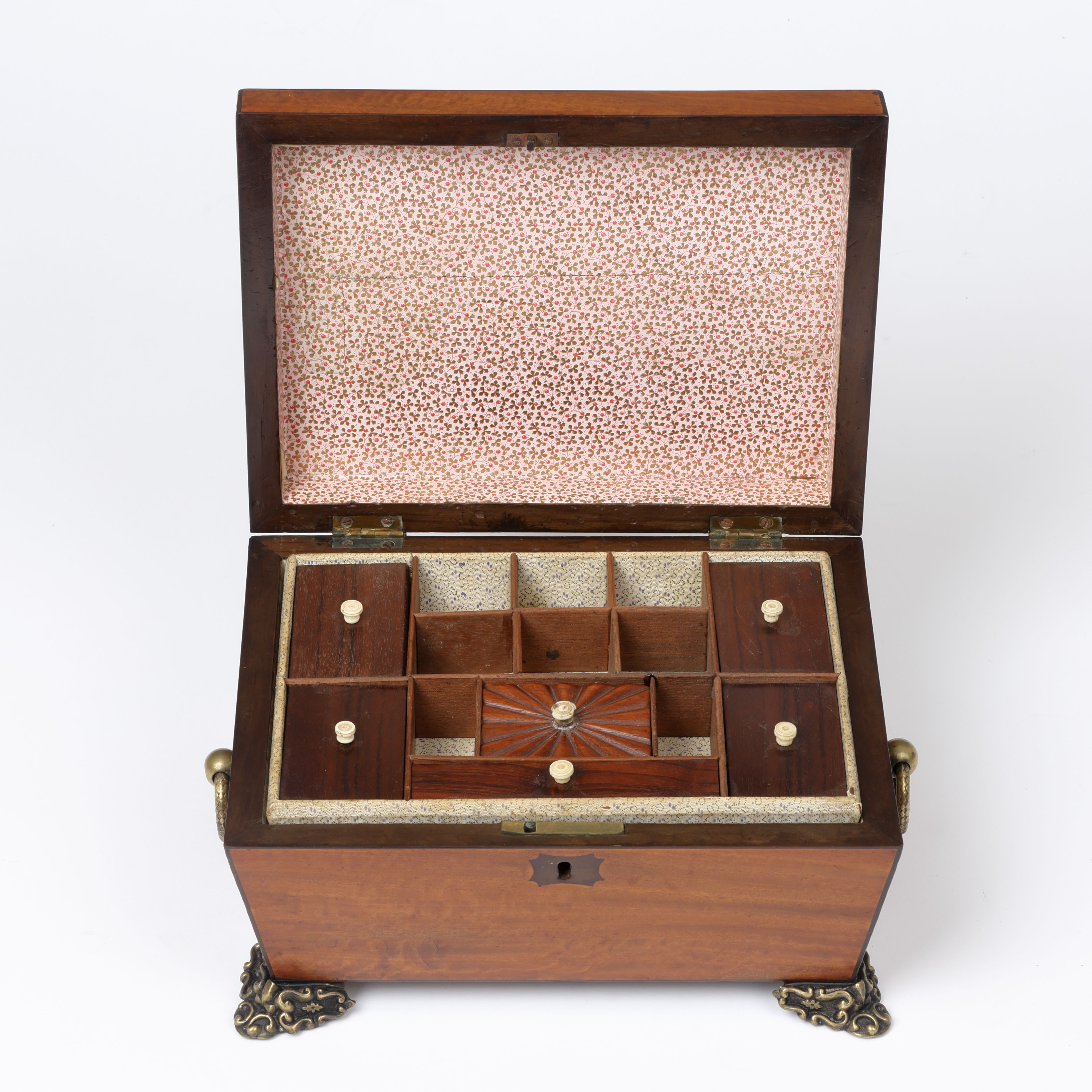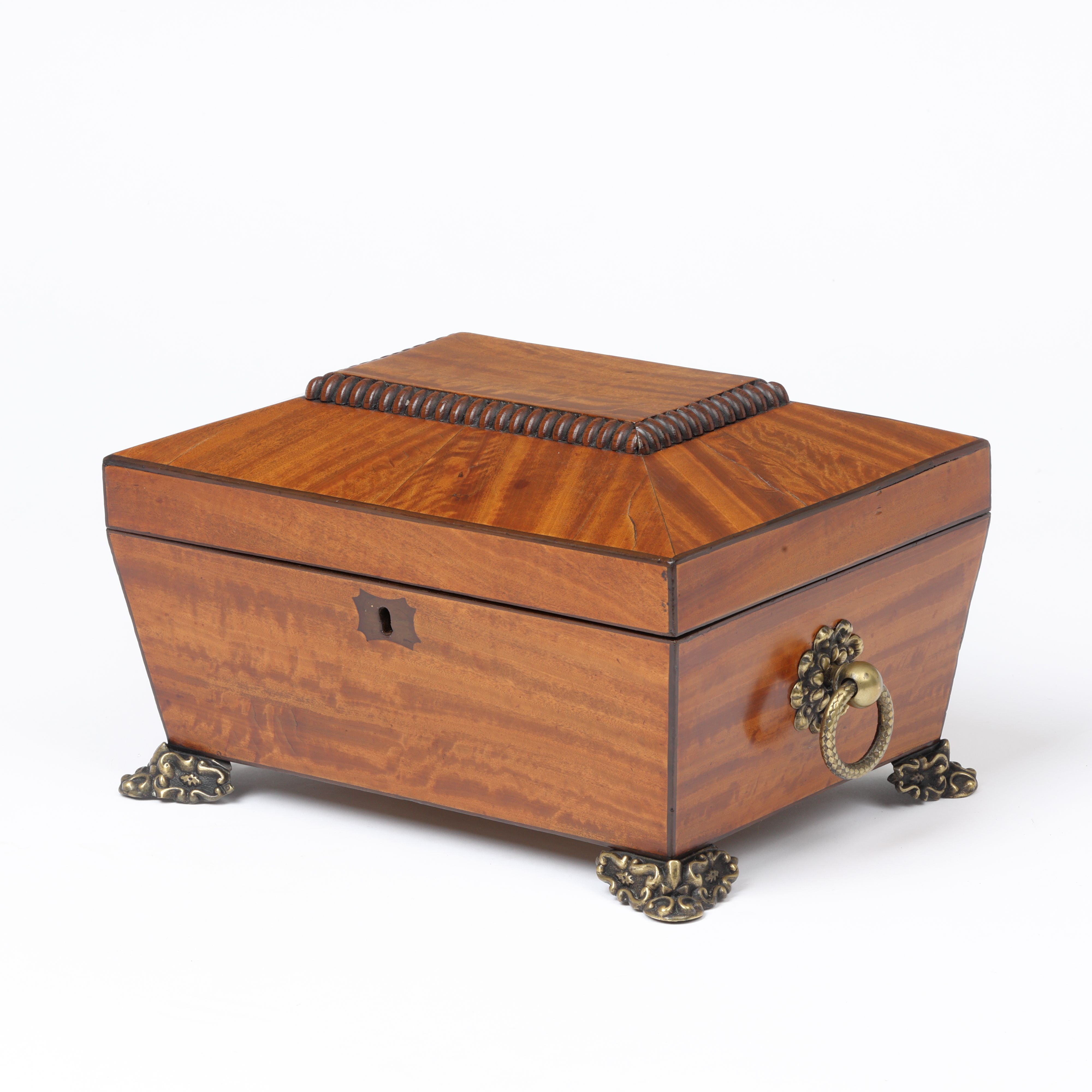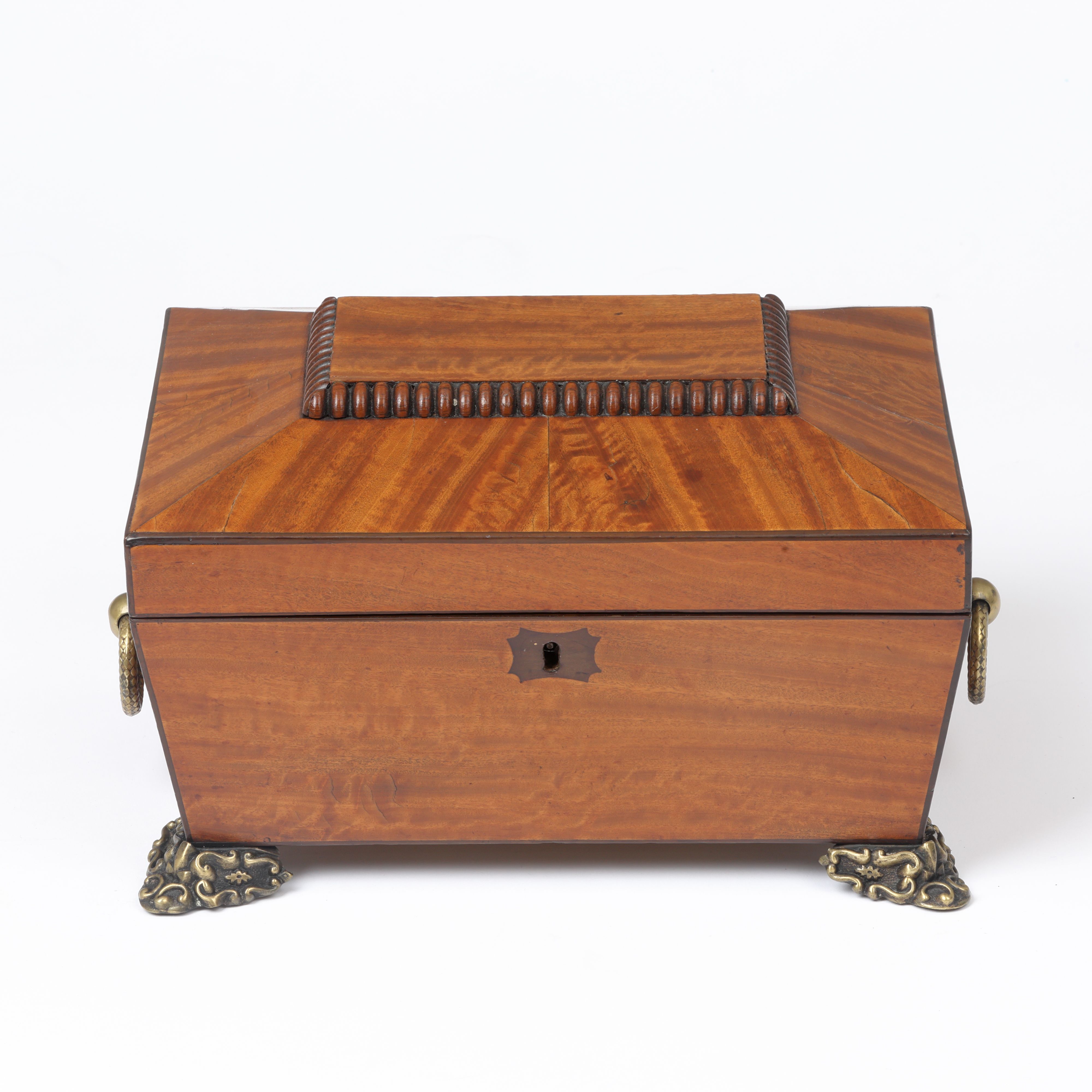 A fine early 19th century satinwood sarcophagus needlework or jewellery box with ornate brass ring handles and feet.